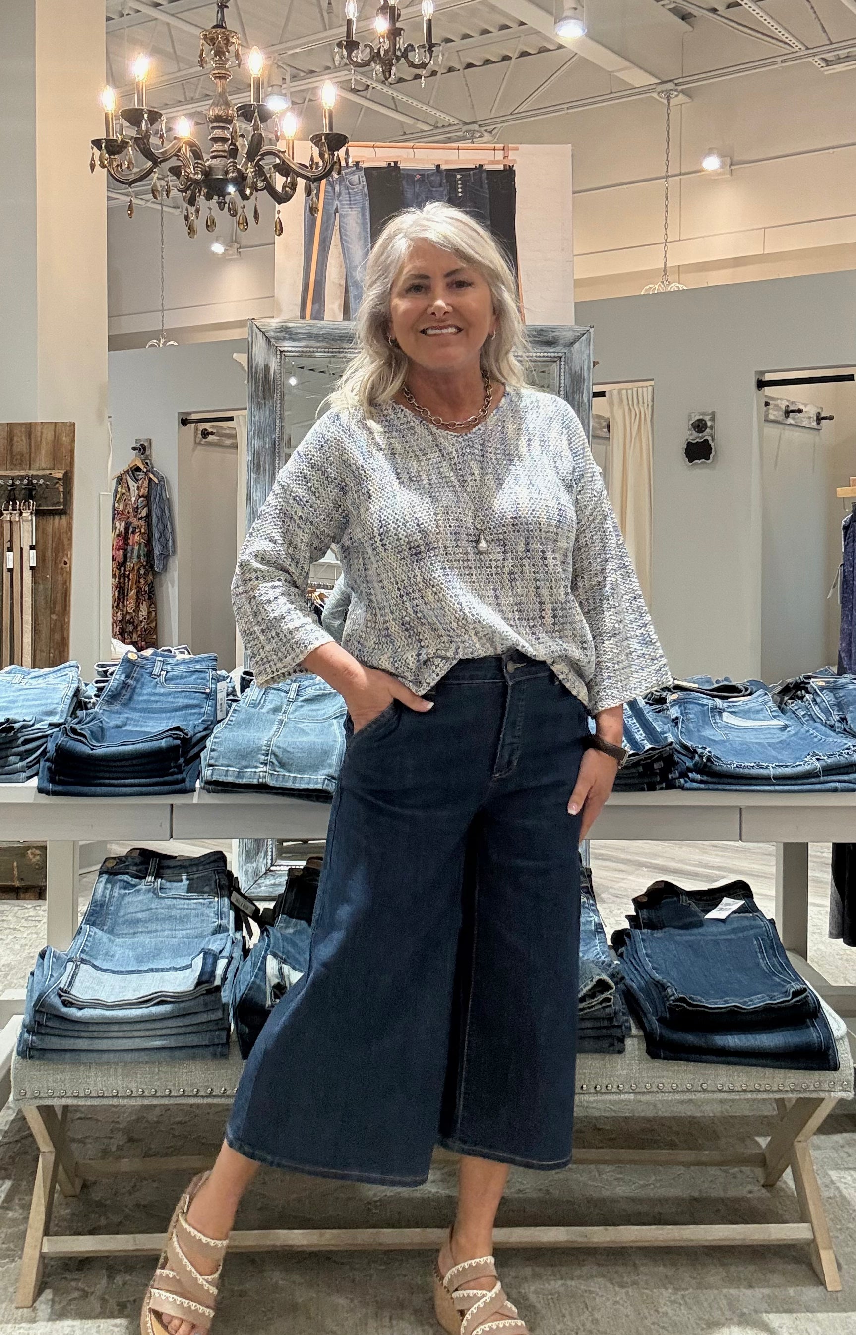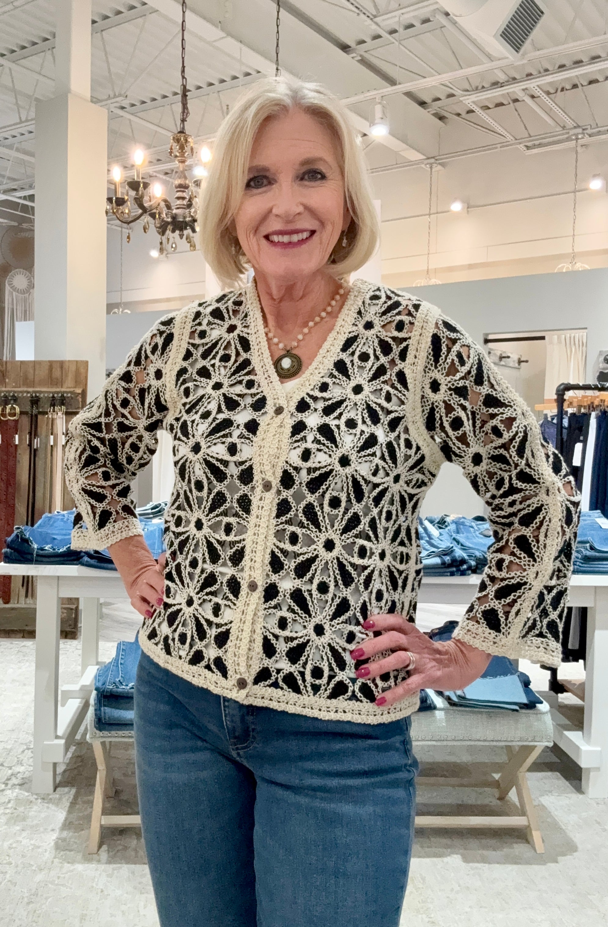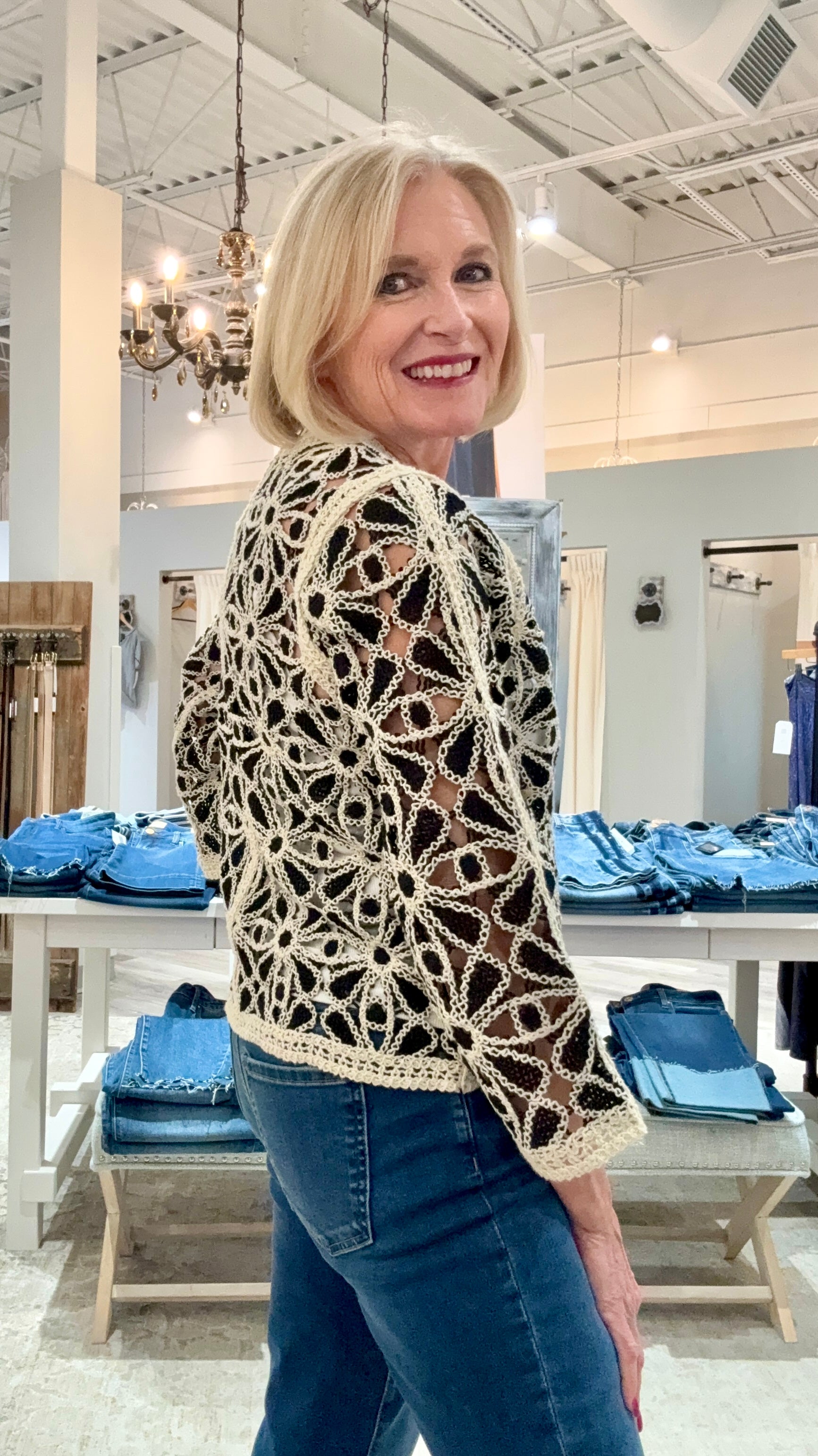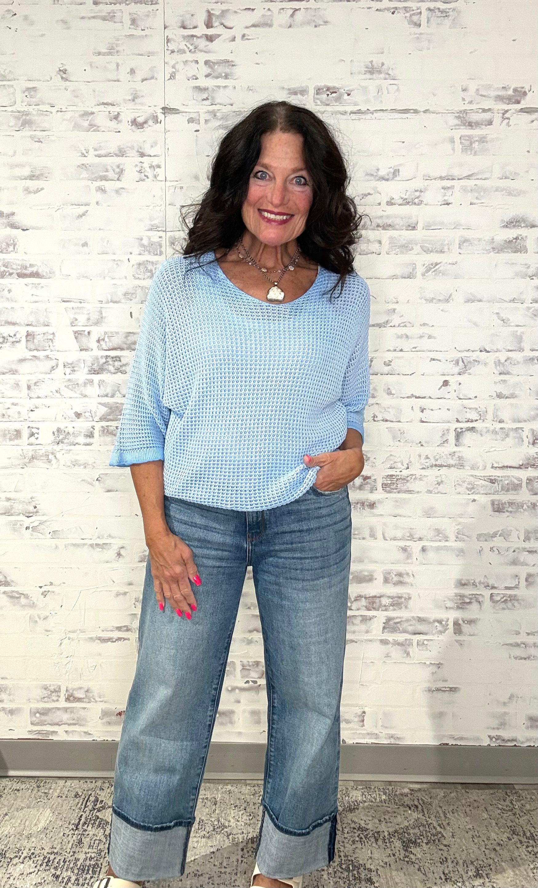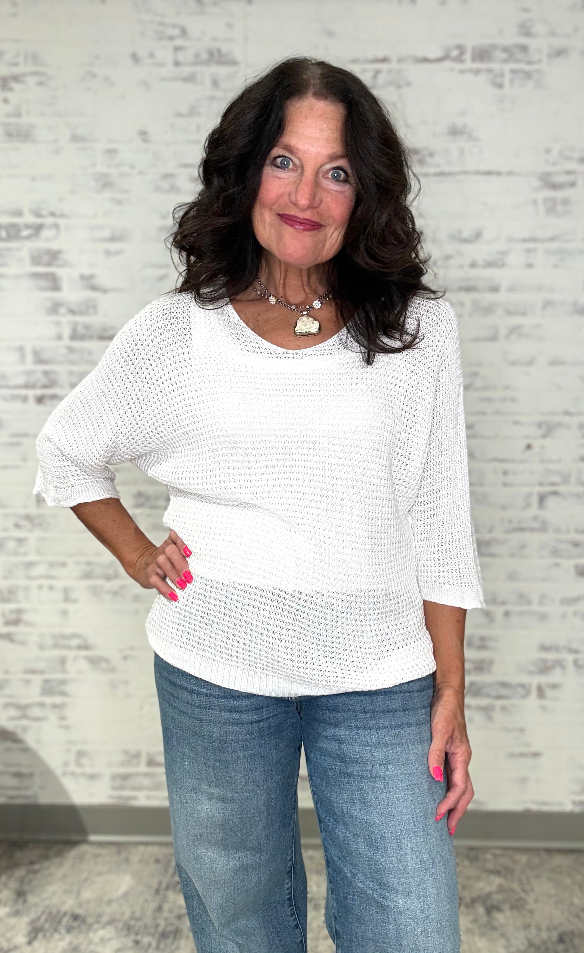 3/4 Sleeve Cold Dyed Crochet Crew Neck Sweater