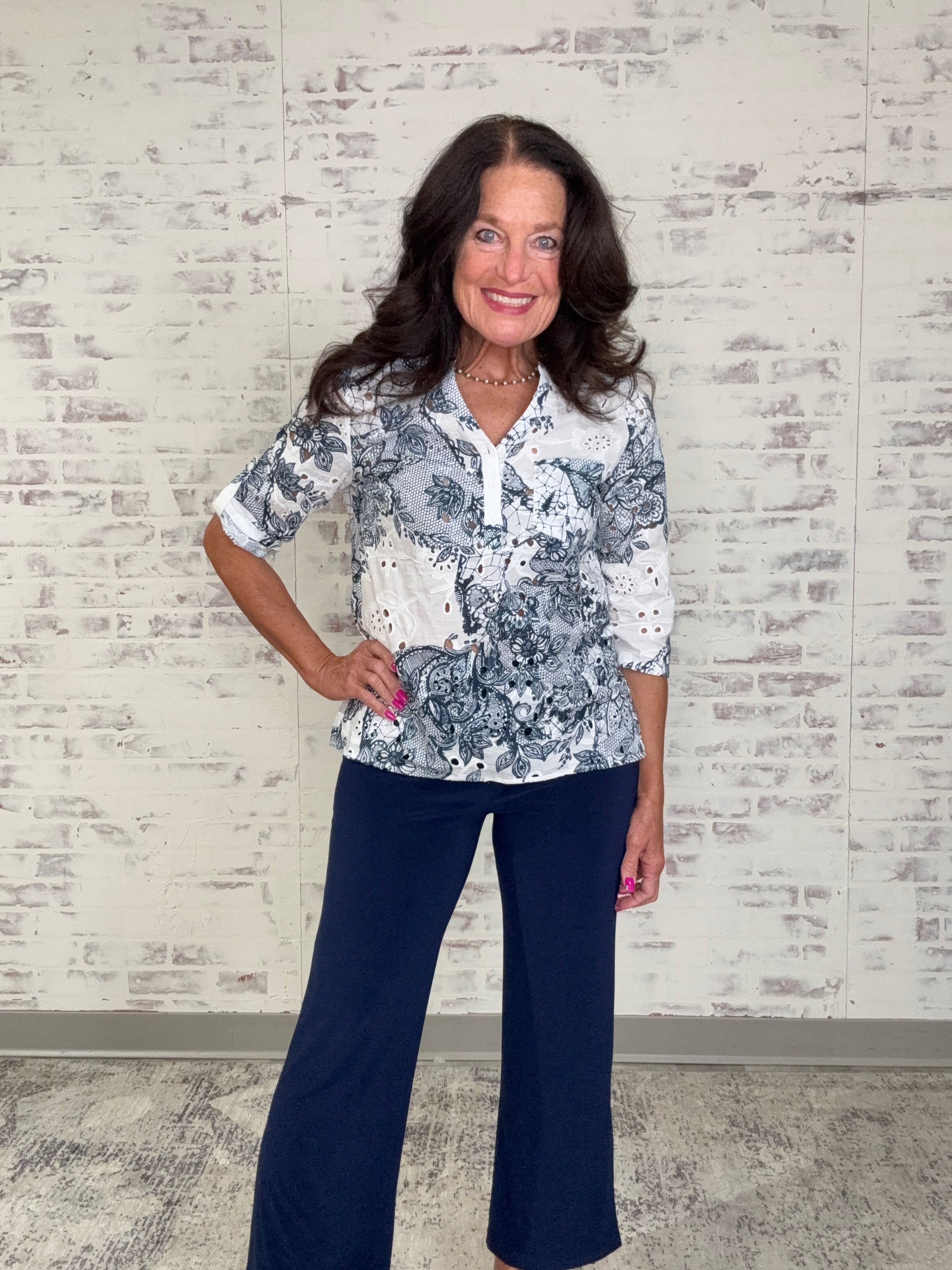 3/4 Roll Up Sleeve Printed Eyelet Henley Blouse