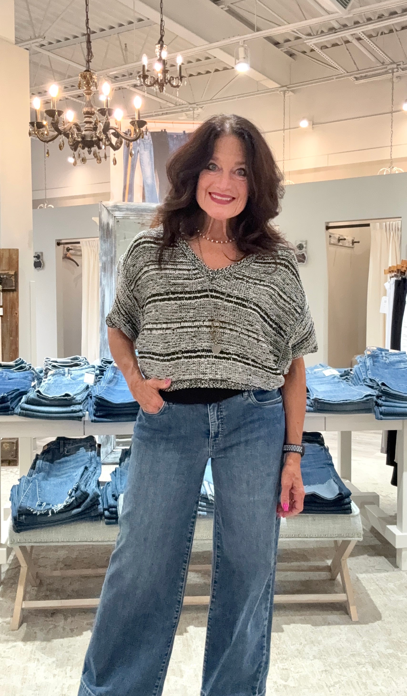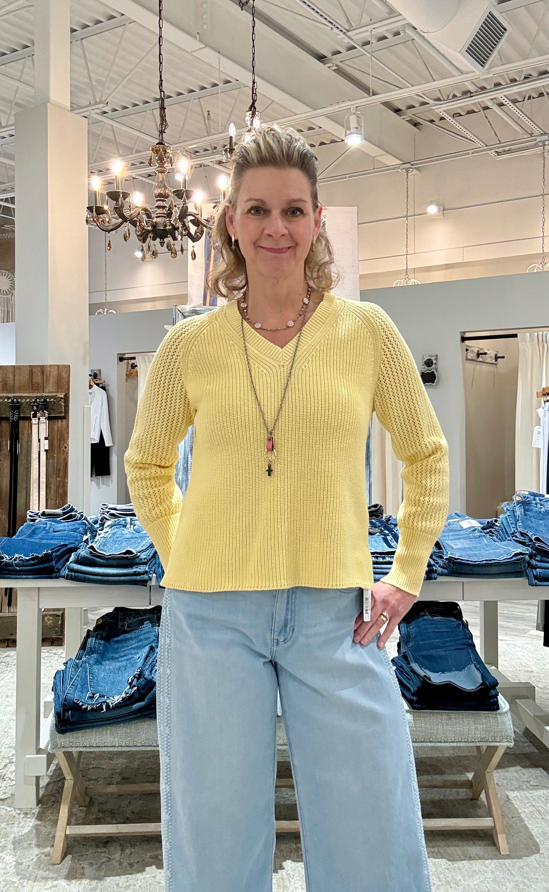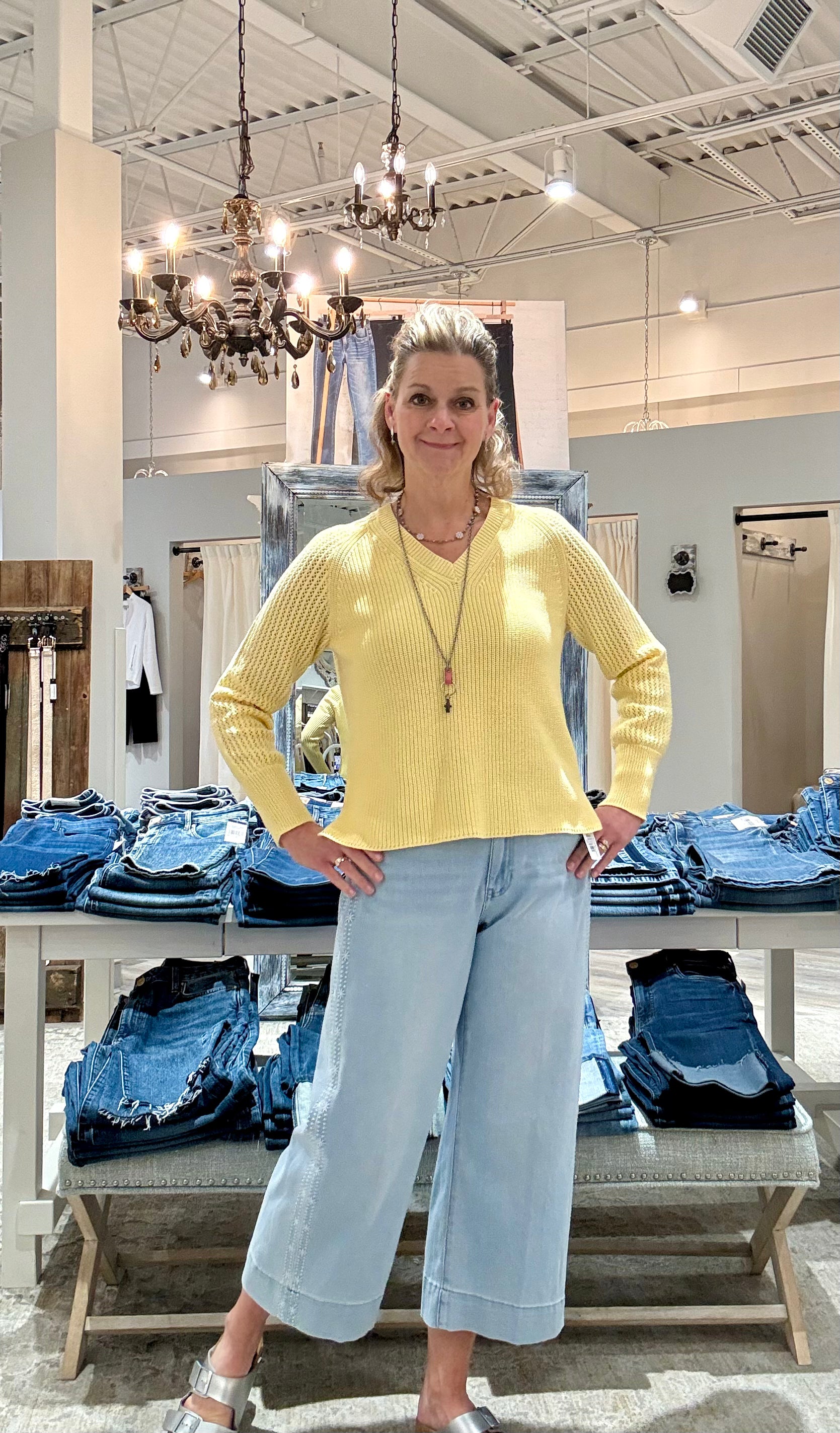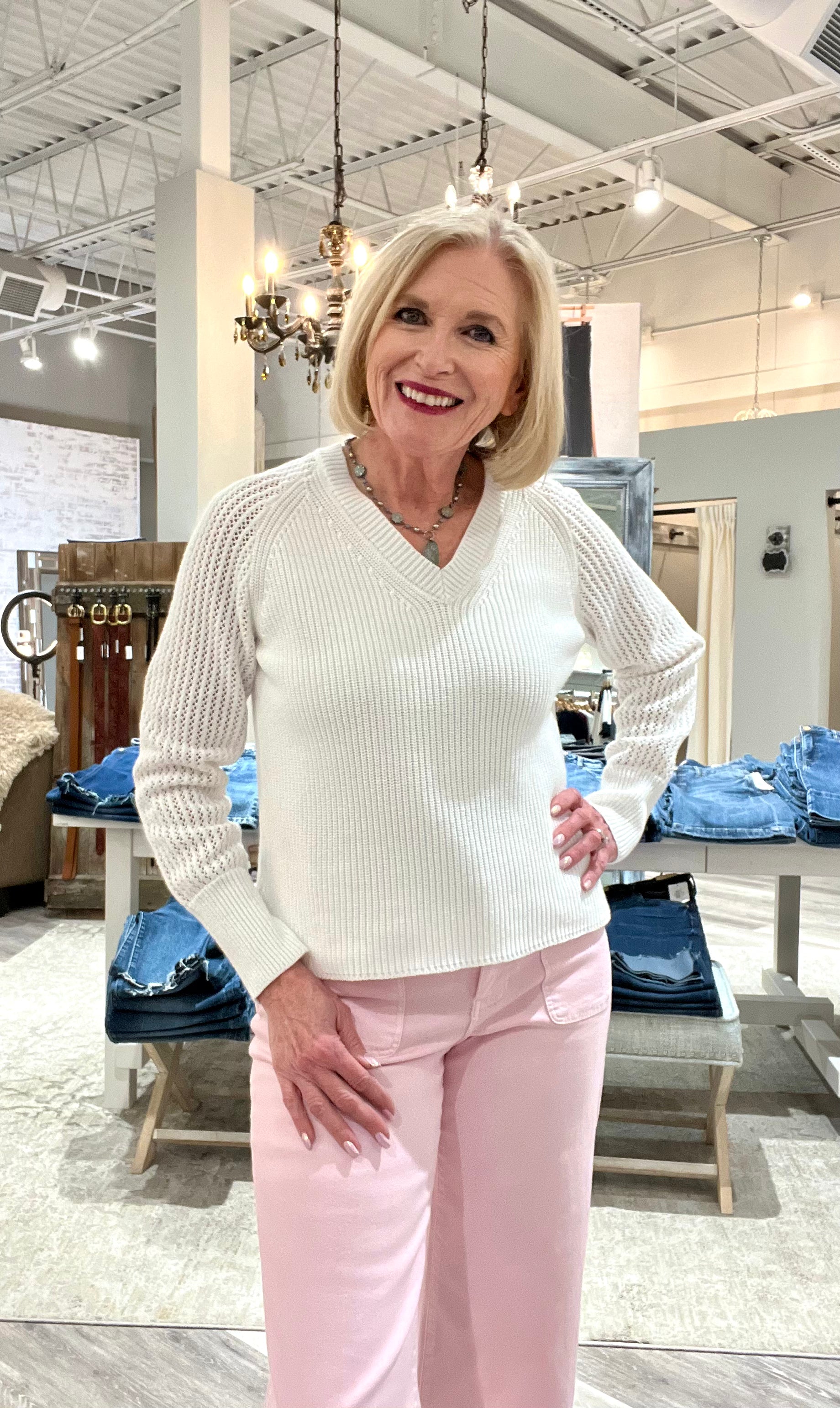 V-Neck Mini Waffle Sweater with Kimono Sleeve and Wide Band Hem