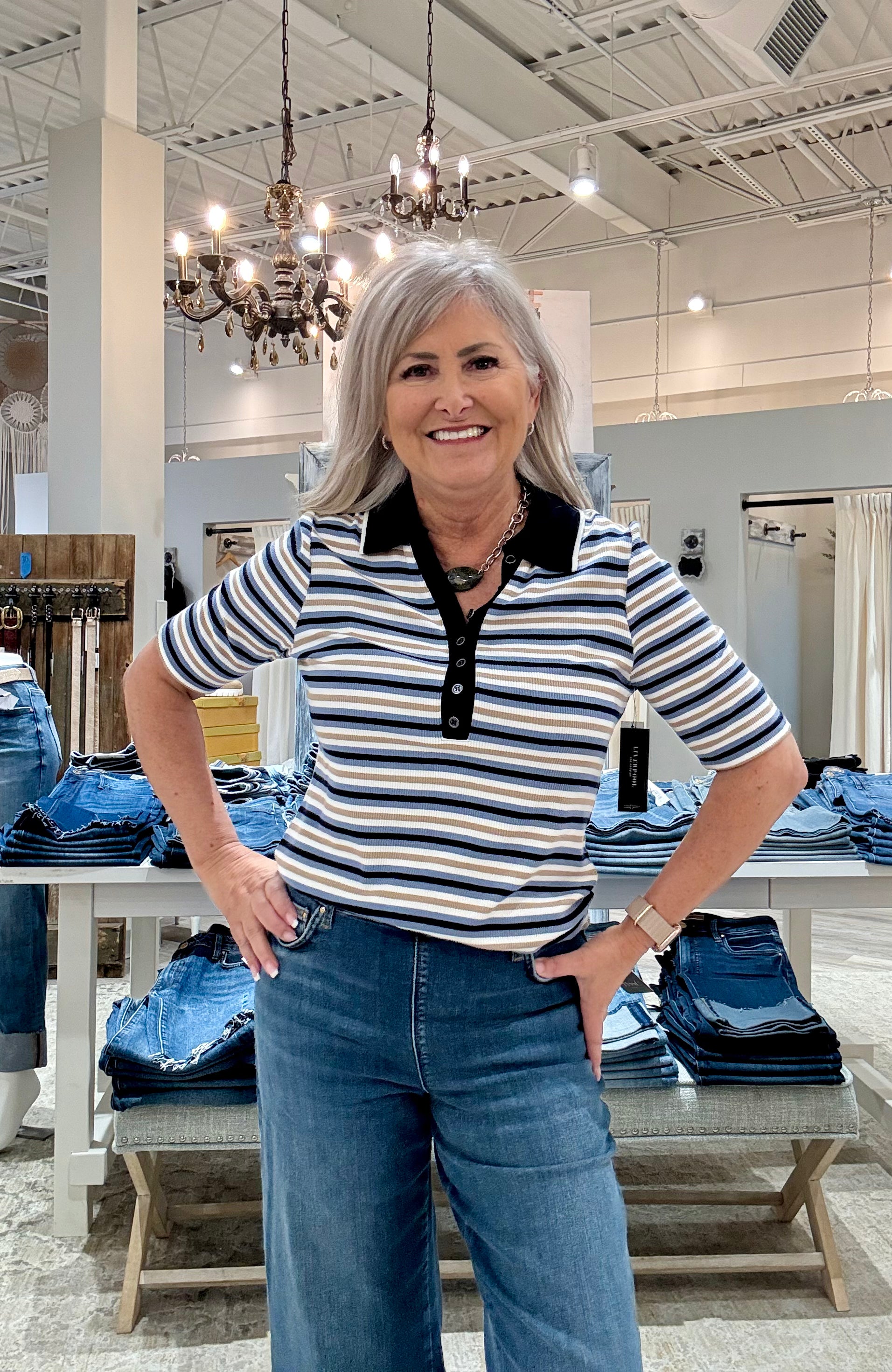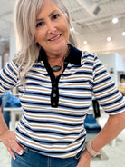 Shirred half sleeve collared henley knit top