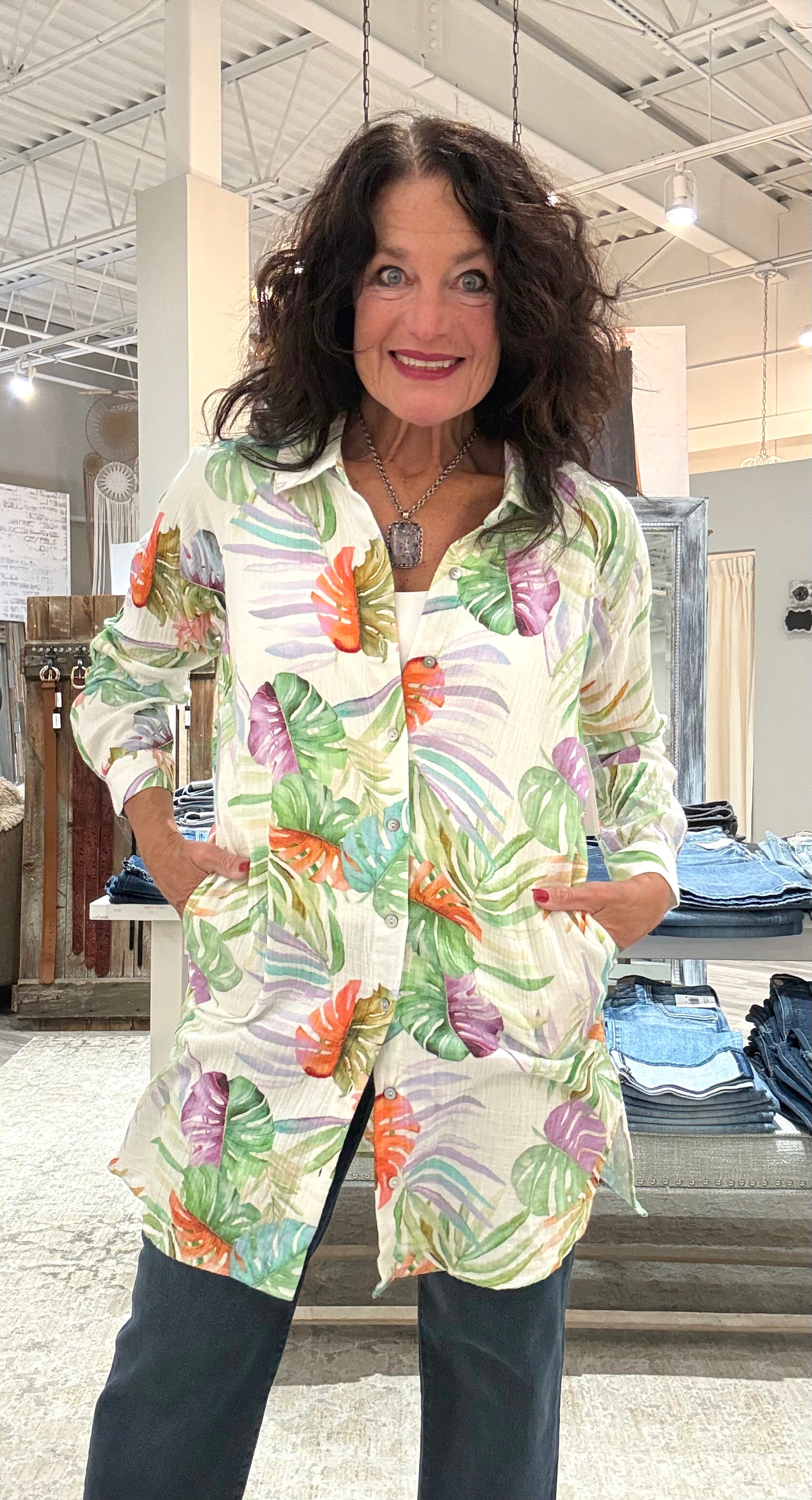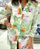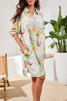 Rolled Long Sleeve Button Front Print Shirt Dress