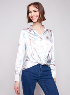 Printed Long Sleeve Button Down Shirt with Twisted Front