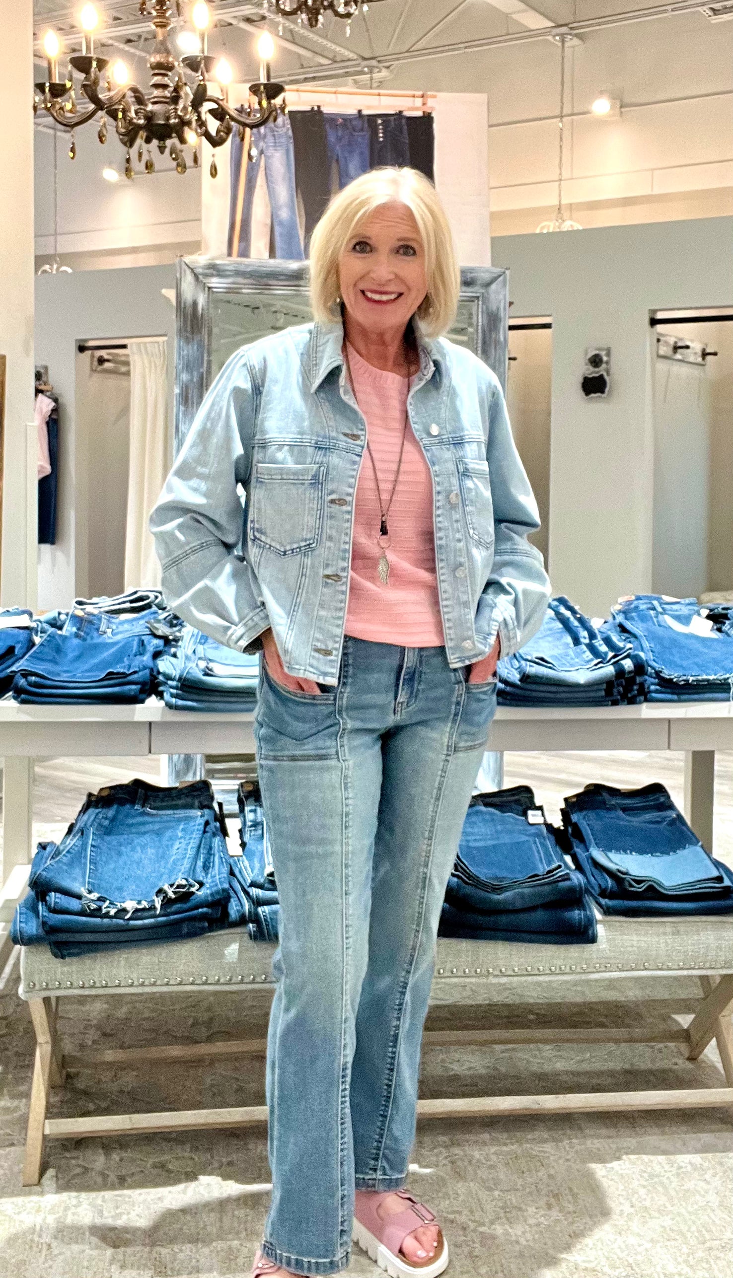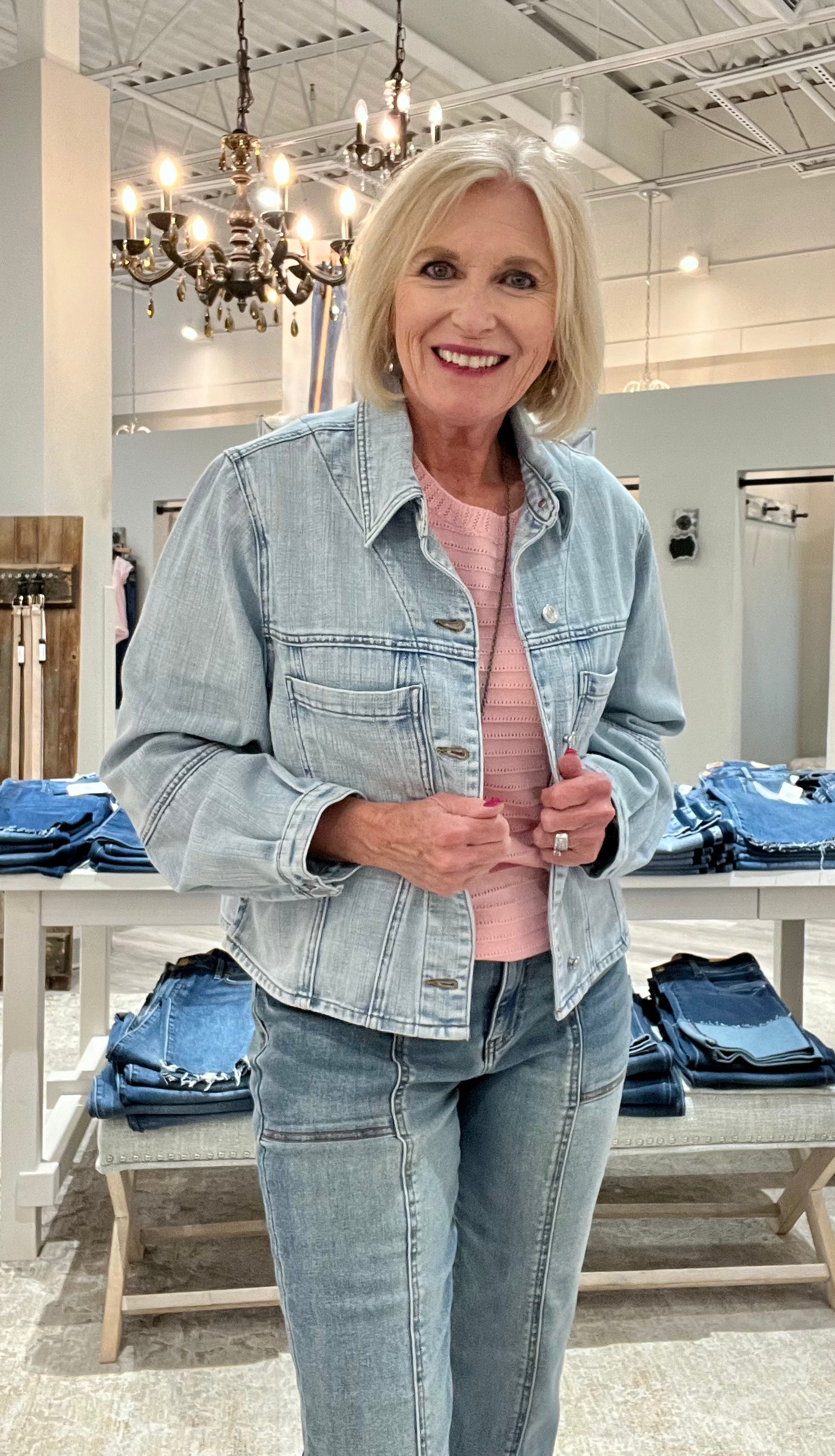 Genevieve Zip Front Denim Jacket with Slant Pockets