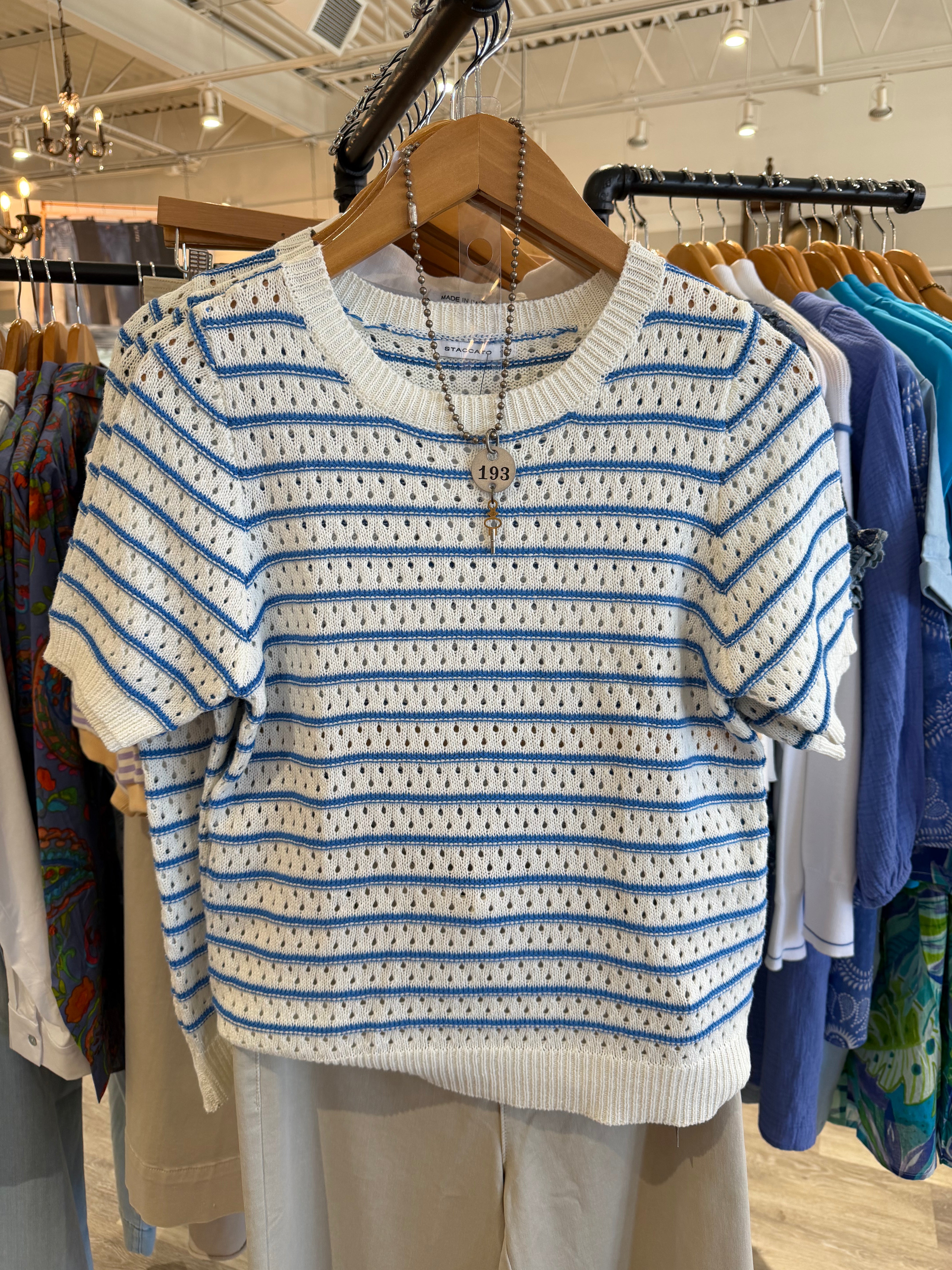 Crochet Striped Short Sleeve Crew Neck Pullover Top
