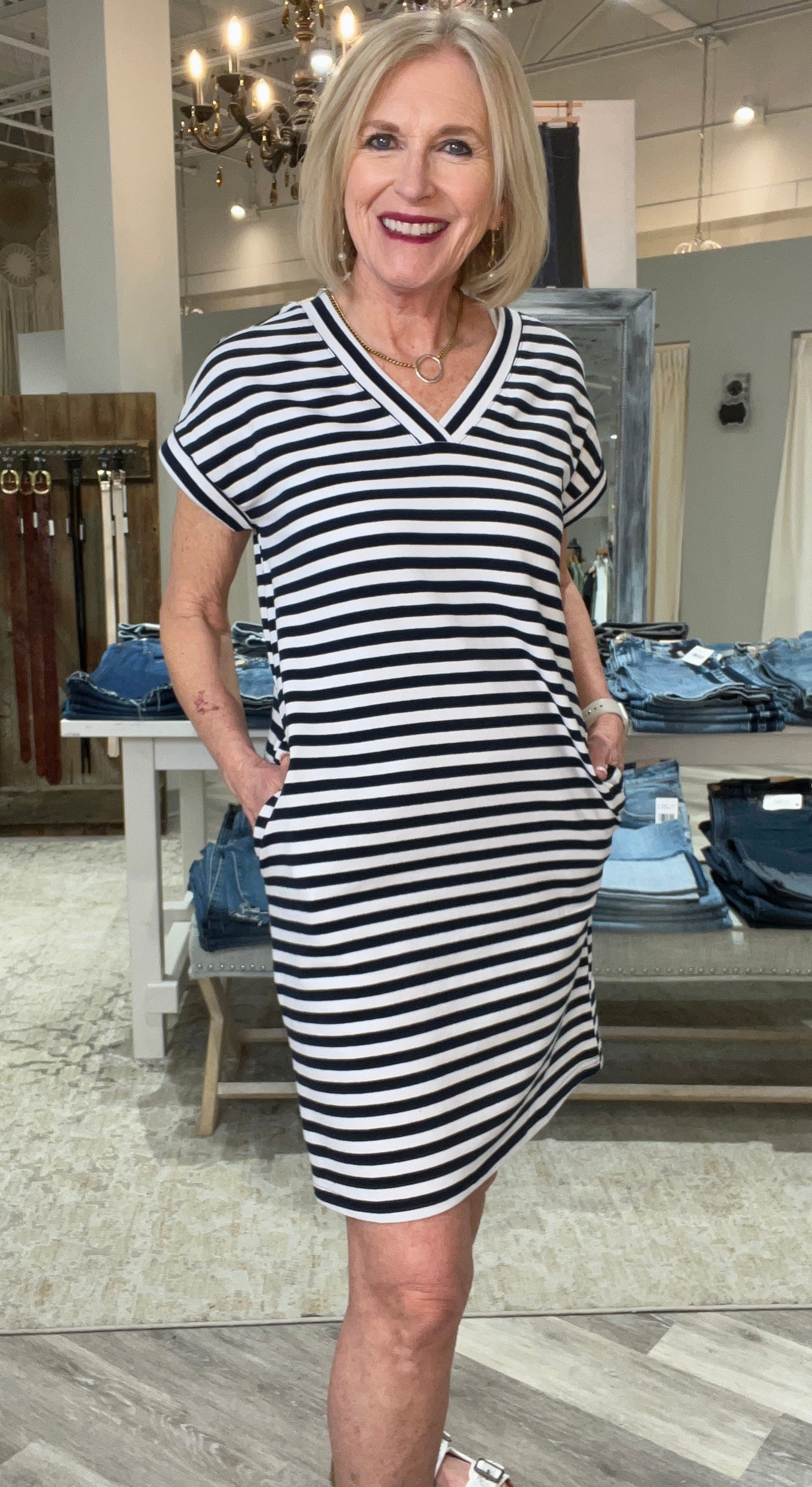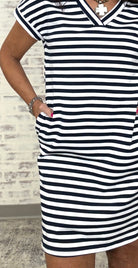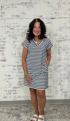 V-Neck Short Sleeve Striped Terry Dress with Pockets